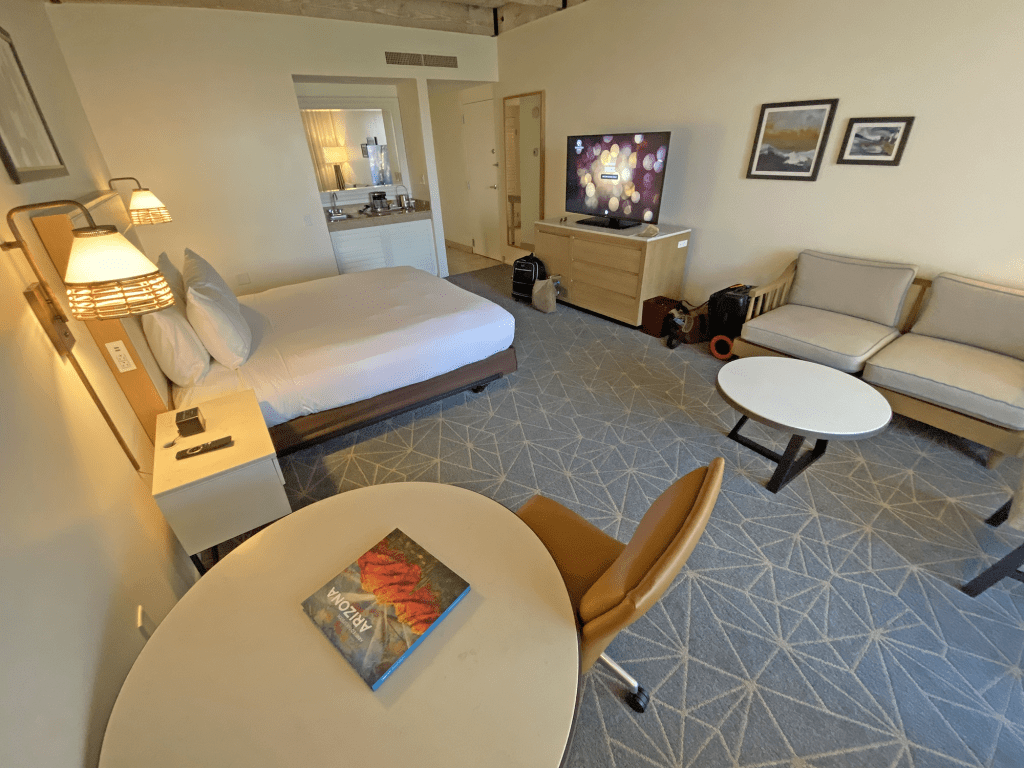 The Guest Room. We were reserved in a room with a king bed and balcony facing the courtyard. The room is large and spacious, the bed was comfortable, and the typical hotel amenities were available in the room (coffee maker, small refrigerator, sofa, TV, etc.). Everything was clean, tidy, and well-presented. The bathroom is a typical size, but the shower is rather large. The room has a generally rustic, southwest theme to it with wooden beams on the ceiling, too. During our stay, all of the appliances worked properly and easily.
